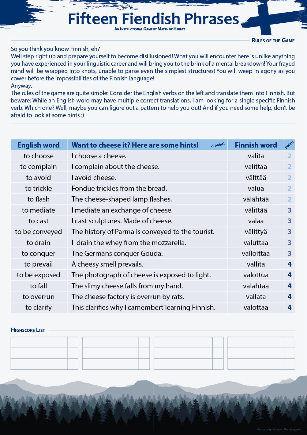 Ever wished that learning vocabulary was both more annoying and more competitive? Well have I the solution for you! With this interactive 'game', endless minutes of 'fun' are guaranteed. Highscore list included! What is a good score you ask? Well, as a Finnish learner, anything positive is honestly an outstanding result. After staring at this poster for ~10h while designing it, I am proud to have reached a score of eleven! And if you manage to achieve half of the maximum score (23/45), consider yourself a native speaker. But before you start, this one requires a bit of arts and crafts: Cut out 30 rectangles of thick paper and Scotch-tape them over each cell in column two and three, so that you can reveal them one at a time to check if you have guessed correctly. Finally, tape it to your office door and let your co-workers compete!